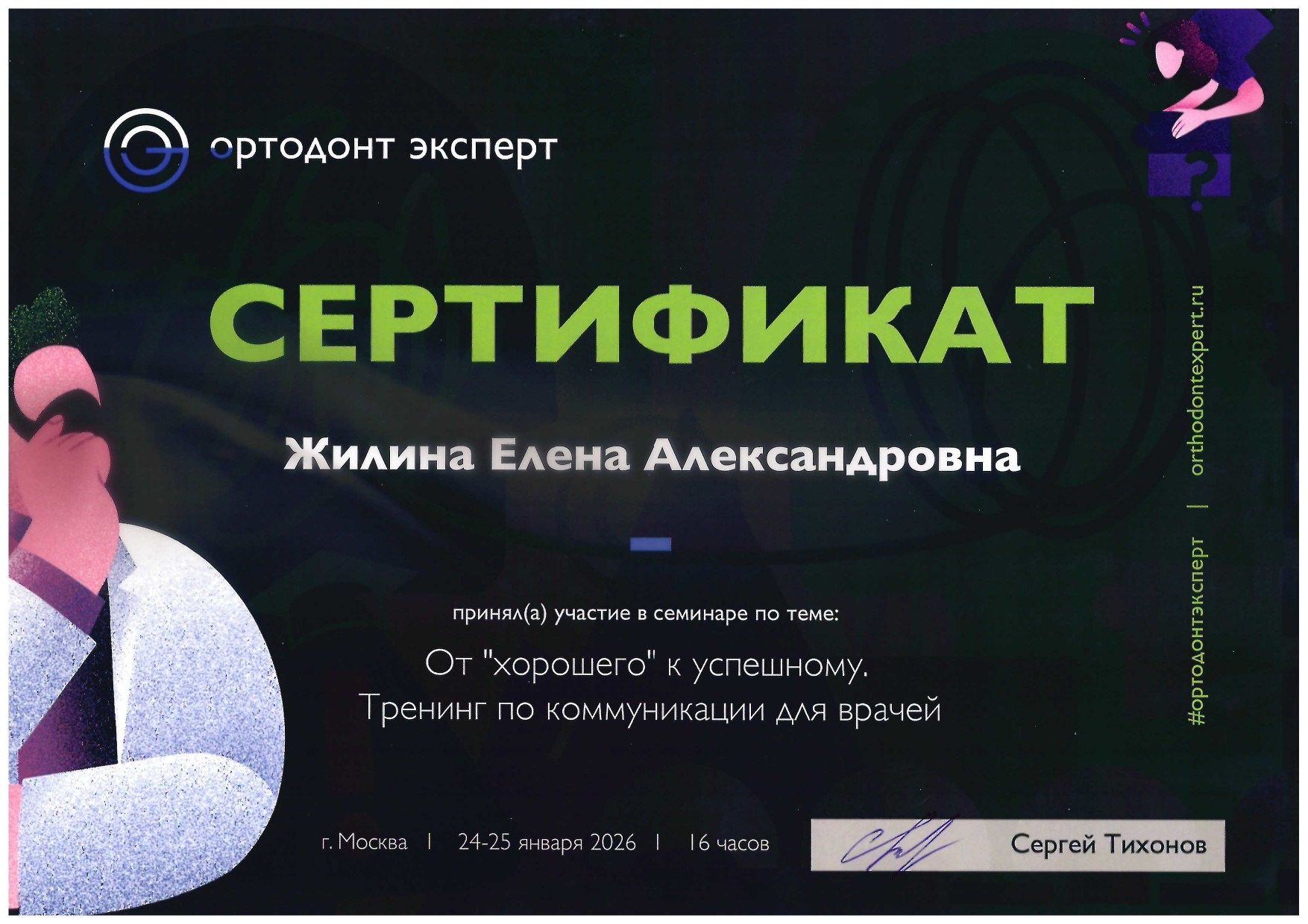В 2026 г. приняла участие в семинаре по теме: От «хорошего» к успешному. Тренинг по коммуникации для врачей. г. Москва.